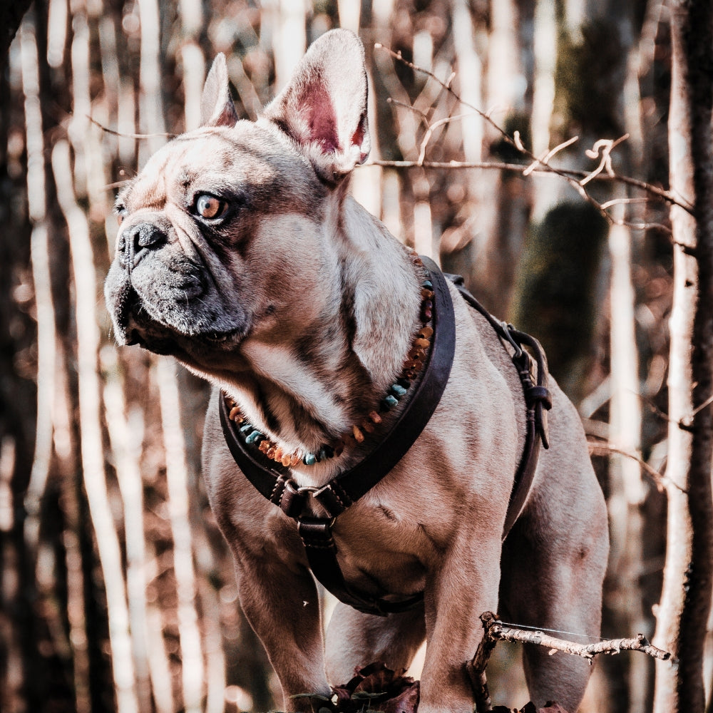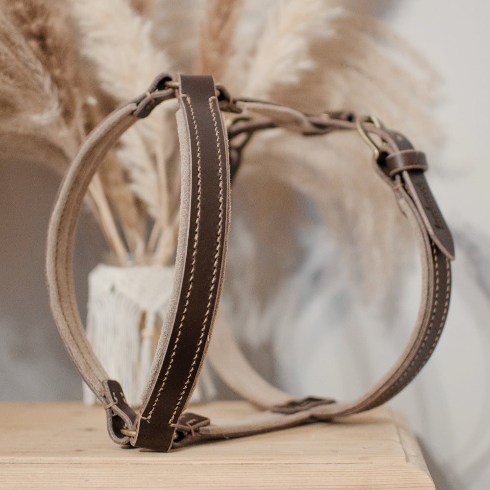 Das gepolsterte Ledergeschirr in der Farbe Braun aus der ‚Wildfang‘ Kollektion wird in unserer Münchner Manufaktur in traditioneller Handarbeit für deinen Hund maßgefertigt.