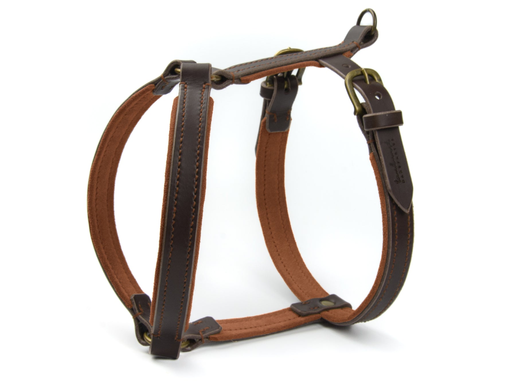 Das gepolsterte Ledergeschirr in der Farbe Dunkelbraun aus der ‚Wildfang‘ Kollektion wird in unserer Münchner Manufaktur in traditioneller Handarbeit für deinen Hund maßgefertigt.