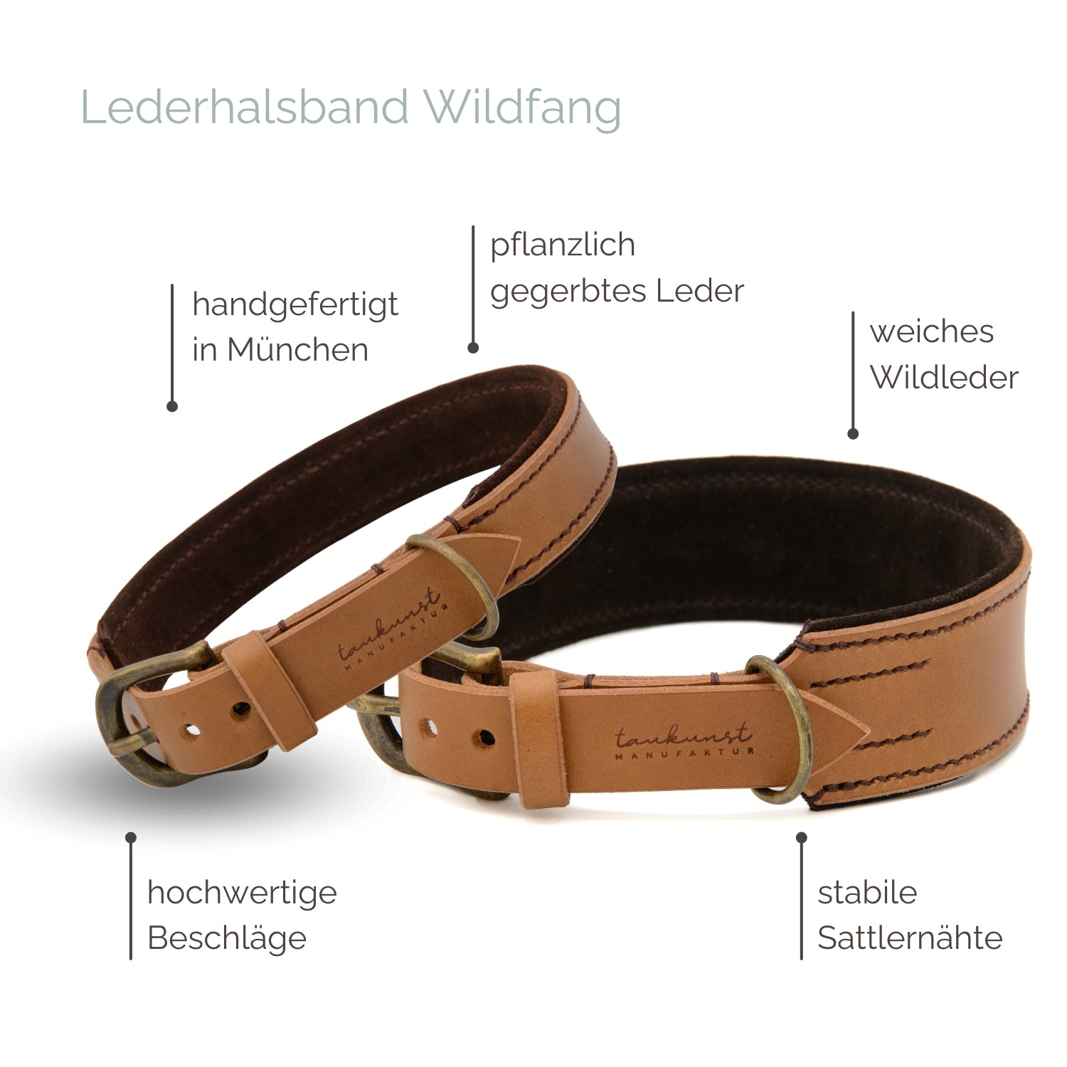 Das gepolsterte Lederhalsband in der Farbe Camel aus der ‚Wildfang‘ Kollektion wird in unserer Münchner Manufaktur in traditioneller Handarbeit gefertigt.