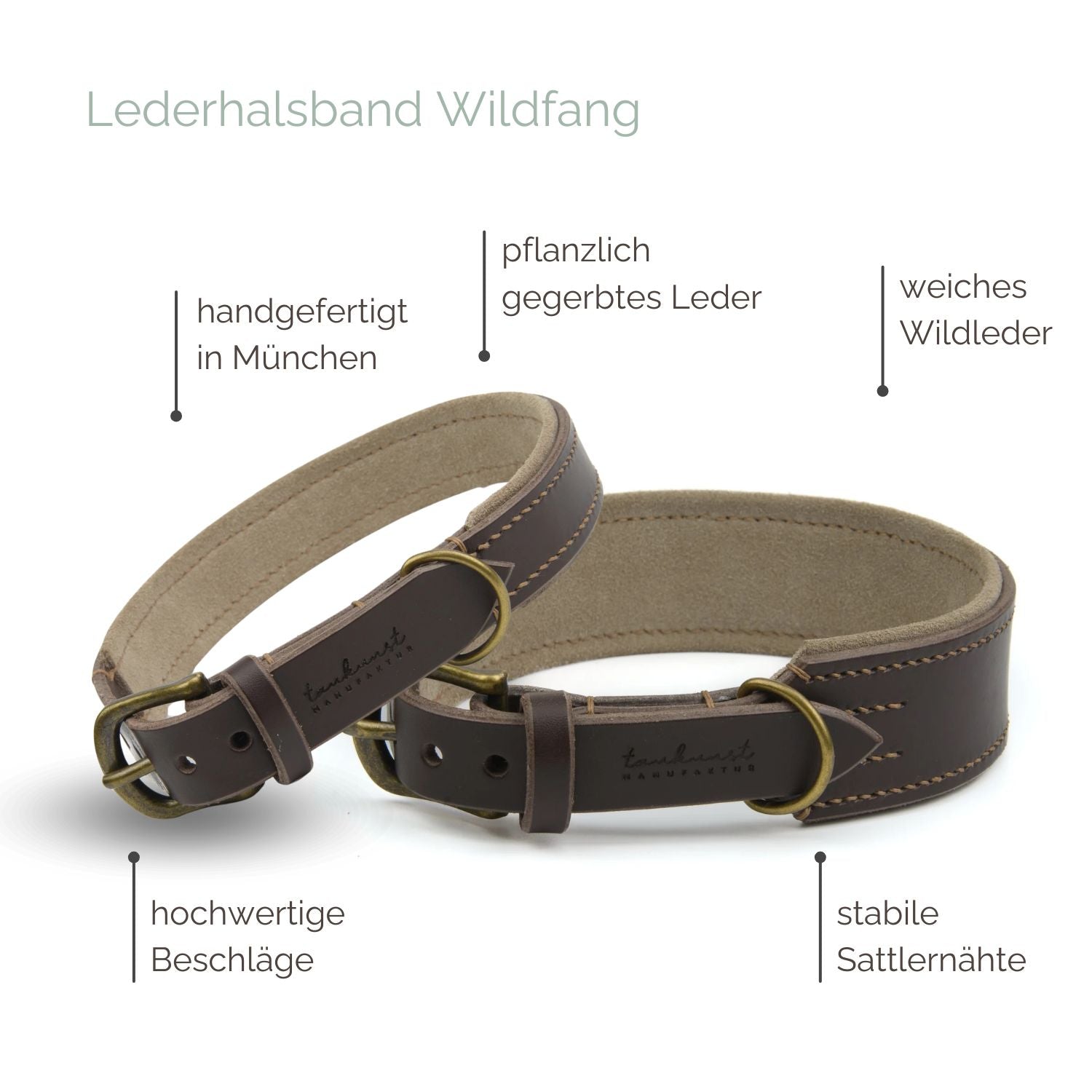 Das gepolsterte Lederhalsband in der Farbe Dunkelbraun aus der ‚Wildfang‘ Kollektion wird in unserer Münchner Manufaktur in traditioneller Handarbeit gefertigt.