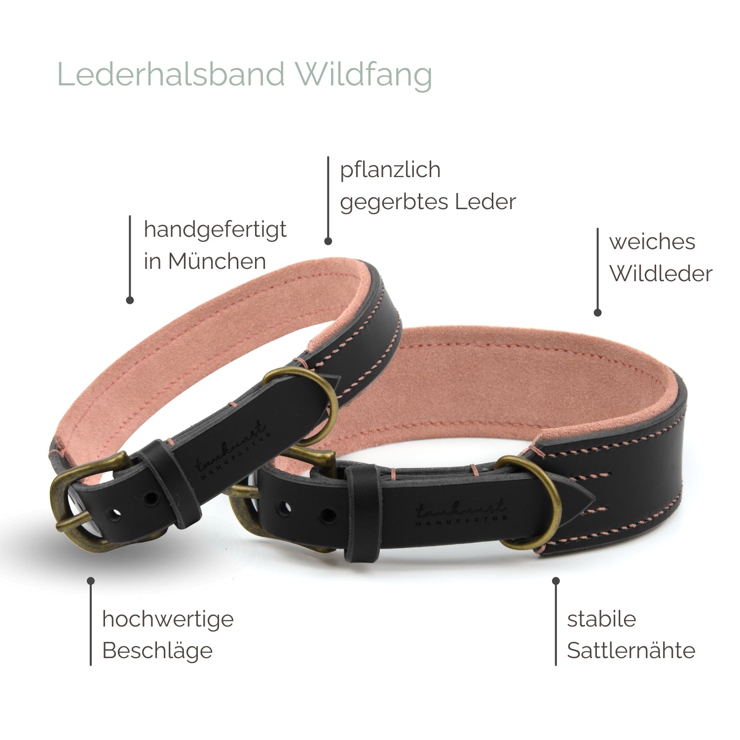 Das gepolsterte Lederhalsband in der Farbe Schwarz aus der ‚Wildfang‘ Kollektion wird in unserer Münchner Manufaktur in traditioneller Handarbeit gefertigt.
