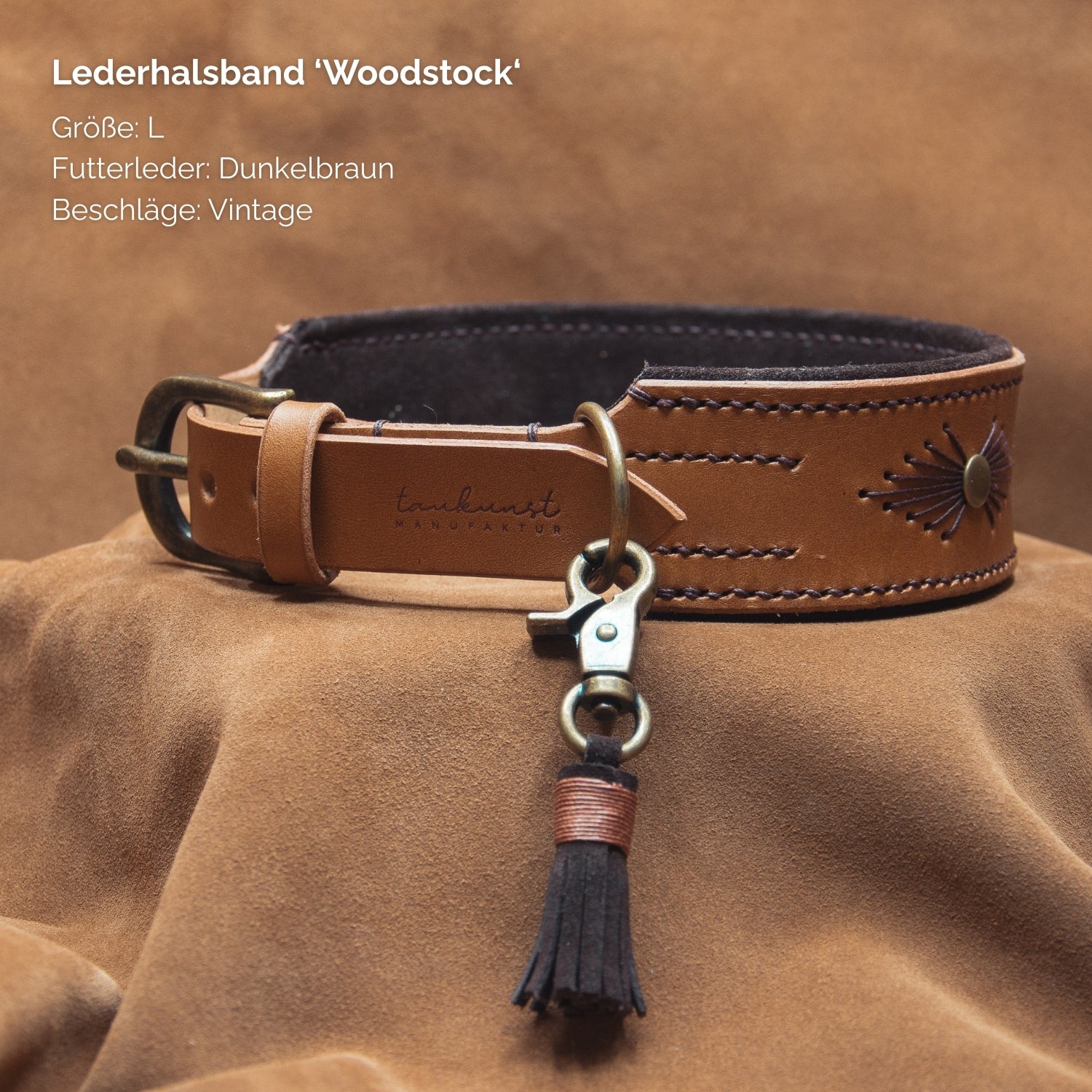 Das gepolsterte Lederhalsband für Hunde in der Farbe Camel aus der 'Woodstock' Kollektion bringt den Spirit von Woodstock ins Hier und Jetzt – mit floraler Stickerei aus feinem Leinengarn, Hippie-Charme und ganz viel Liebe zum Detail.