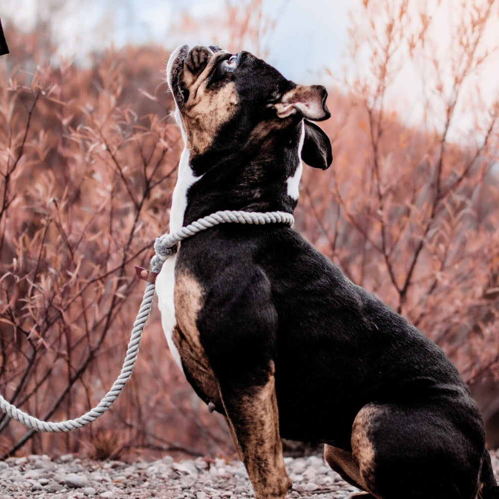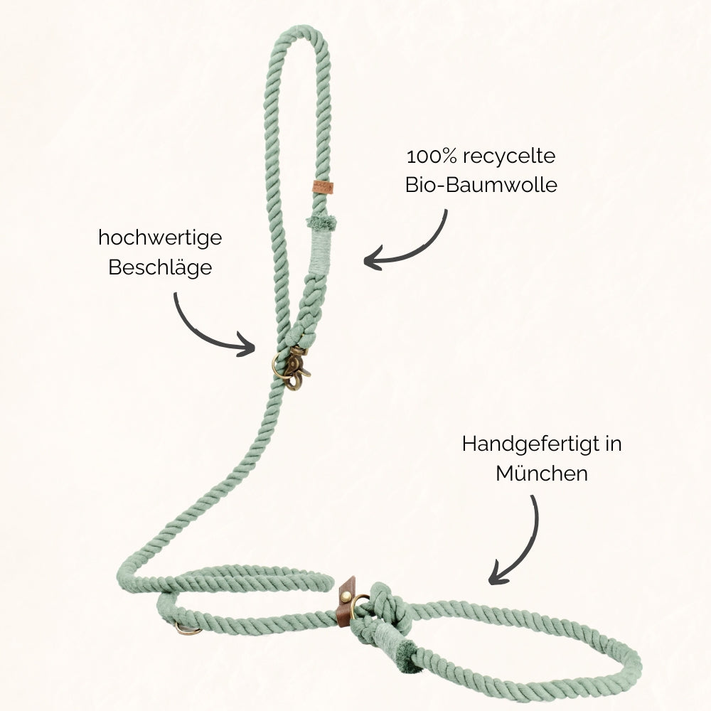 Der Knoten an der Halsung dient als Begrenzung für den Halsumfang und verhindert ein Würgen, wenn Zug auf die Leine kommt.