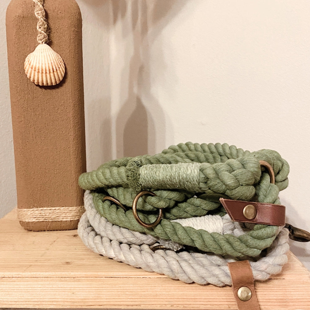 Die Retrieverleine in der Farbe Oliv aus der ‚Ahoi‘ Kollektion wird in unserer Münchner Manufaktur in traditioneller Handarbeit gefertigt.