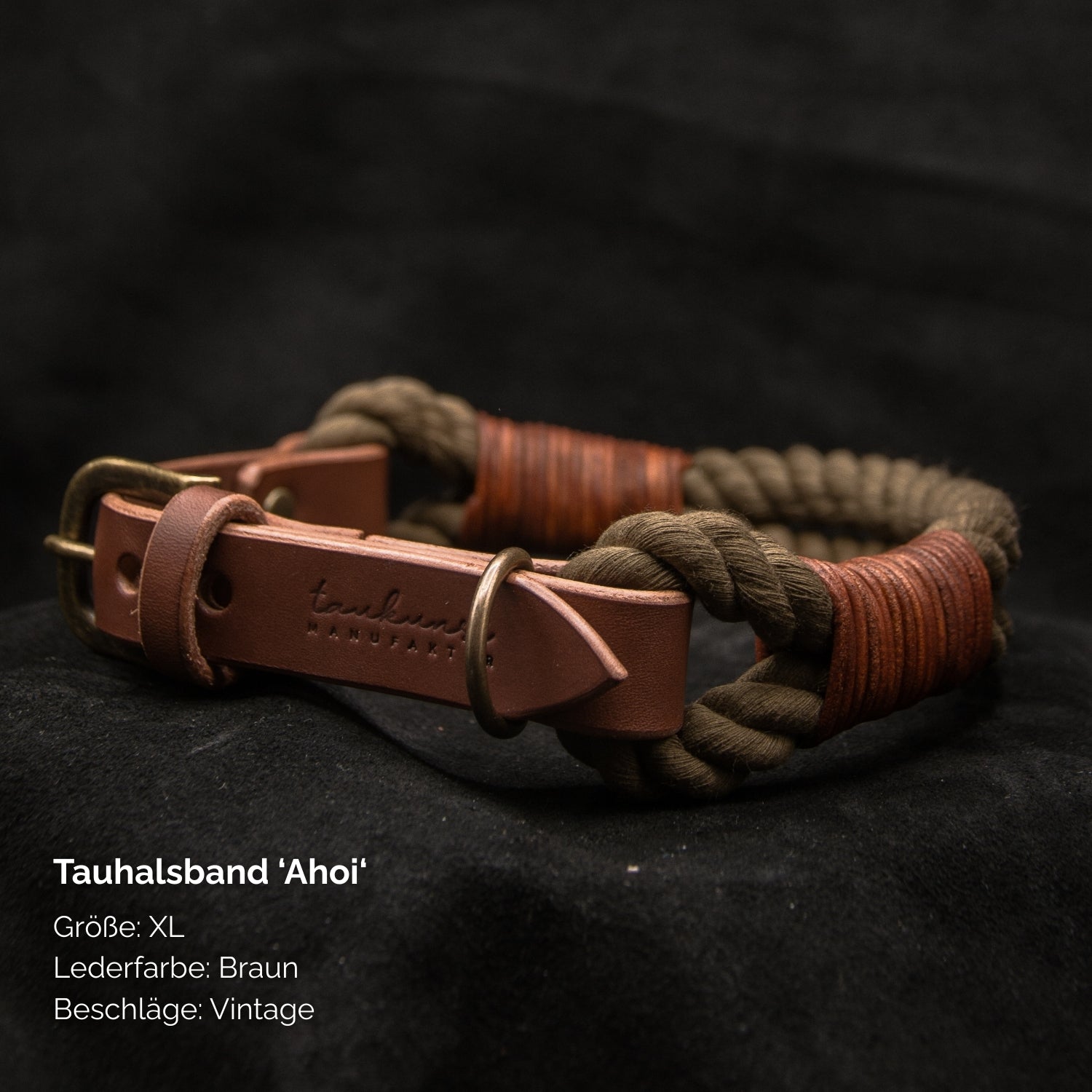 Das Tauhalsband in der Farbe Braun aus der ‚Ahoi‘ Kollektion wird in unserer Münchner Manufaktur in traditioneller Handarbeit gefertigt.