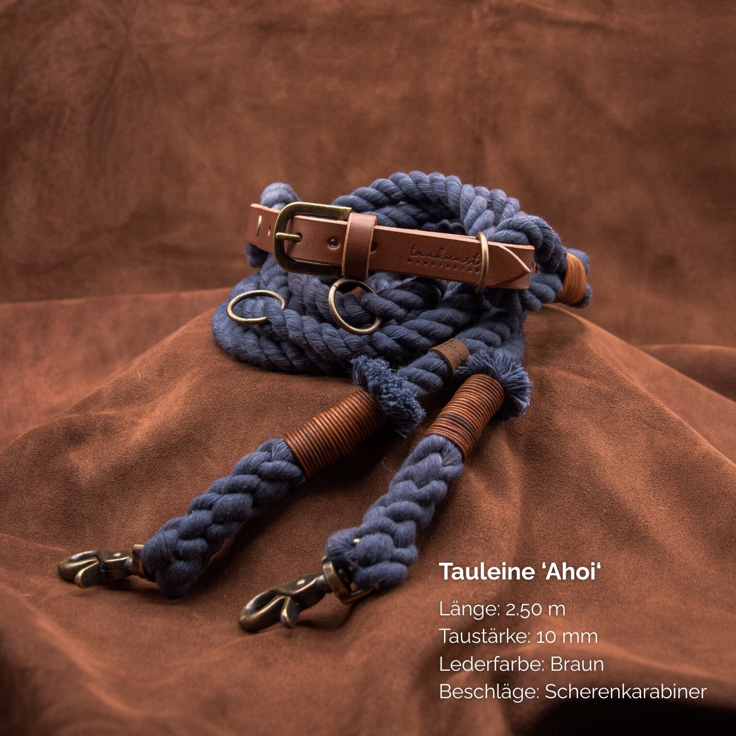 Die Tauleine in der Farbe Nachtblau aus der ‚Ahoi‘ Kollektion wird in unserer Münchner Manufaktur in traditioneller Handarbeit gefertigt.