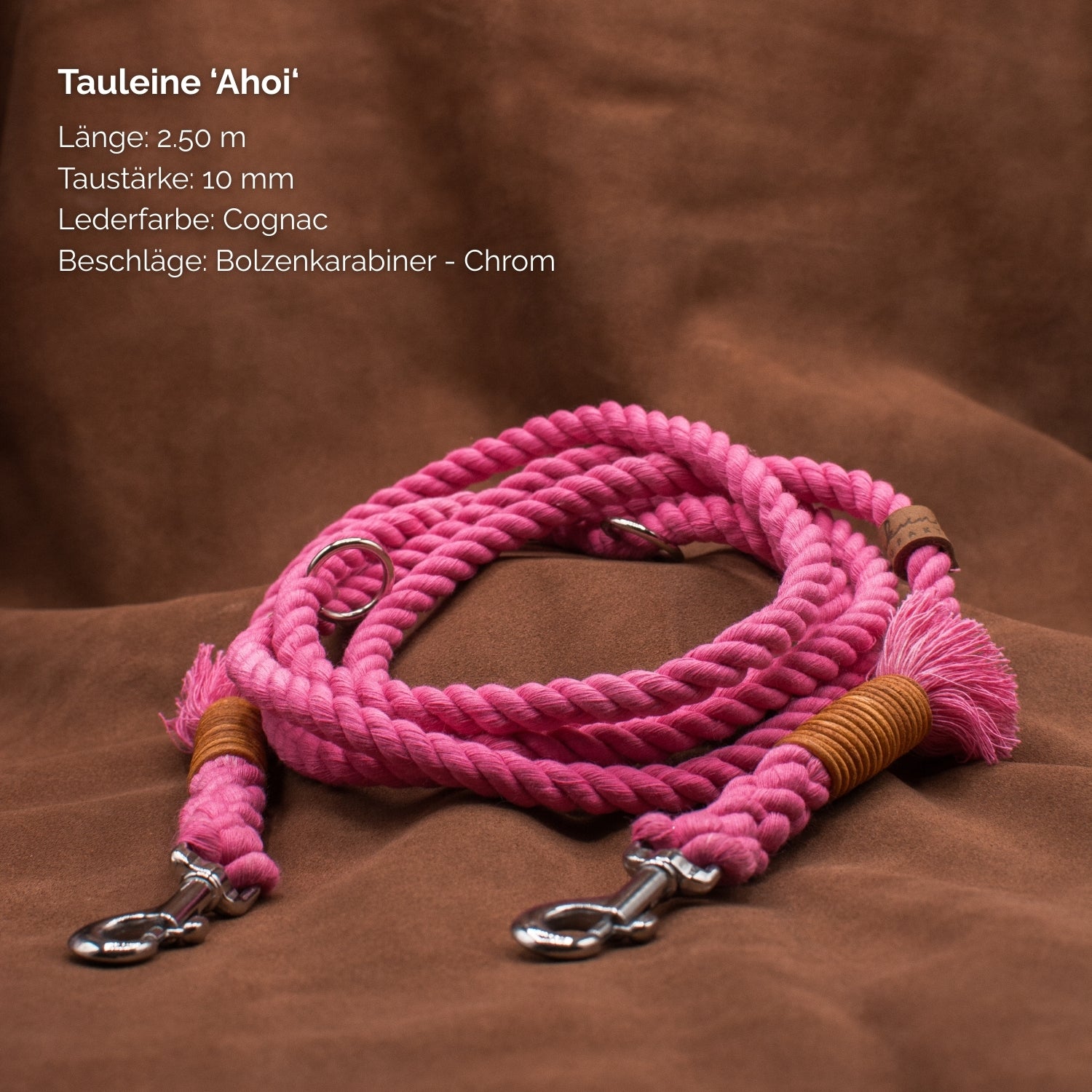 Die Tauleine in der Farbe Pink aus der ‚Ahoi‘ Kollektion wird in unserer Münchner Manufaktur in traditioneller Handarbeit gefertigt.